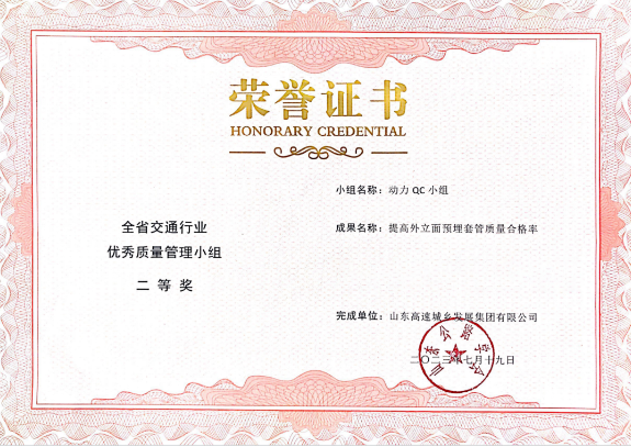 近日,山东高速城乡发展集团QC小组活动项目成果《提高外立面预埋套管质量合格率》由山东公路学会举办的全省“优秀质量管理小组”和“质量信得过班组”评选,荣获全省交通行业优秀质量管理小组二等奖。
