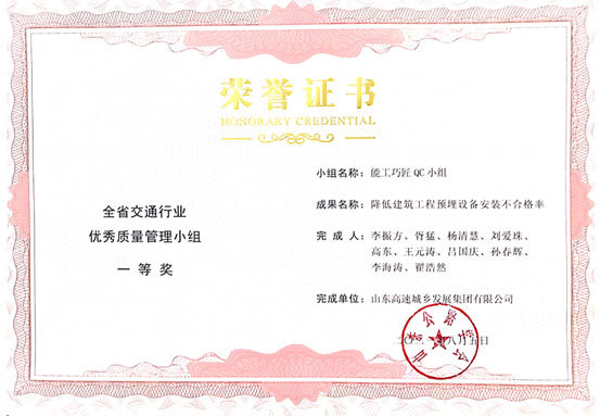 近日,山东公路协会公布了全省交通行业优秀质量管理小组表彰名单,城乡发展集团质量管理成果《降低建筑工程预埋设备安装不合格率》荣获“2021年全省交通行业优秀质量小组一等奖”。