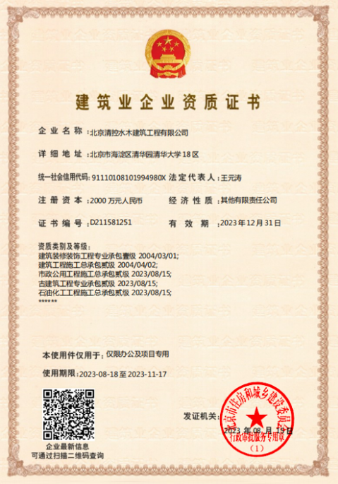 近日,北京清控水木建筑工程有限公司顺利获批“市政公用工程施工总承包贰级”、“古建筑工程专业承包贰级”及“石油化工工程施工总承包贰级”资质。新资质的取得,是公司在工程建设施工、装修装饰、能源产业等领域拓展过程中迈出的坚实一步,进一步拓宽了公司业务承接领域,也为公司赢得了更为广阔的发展空间与机会。